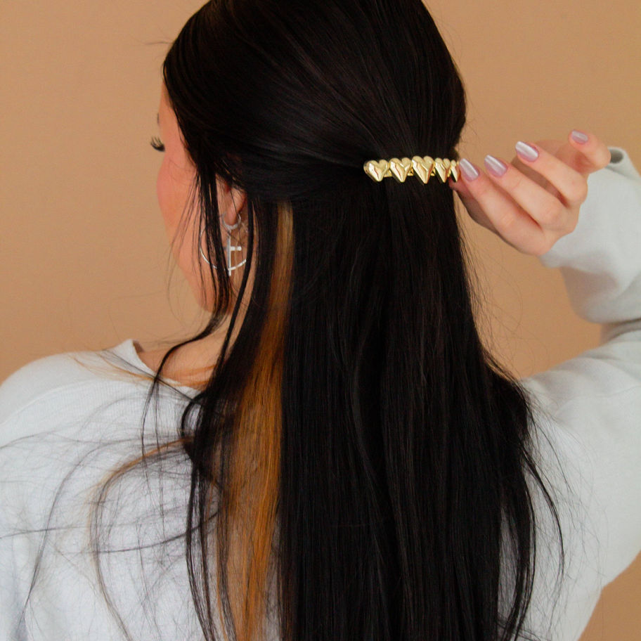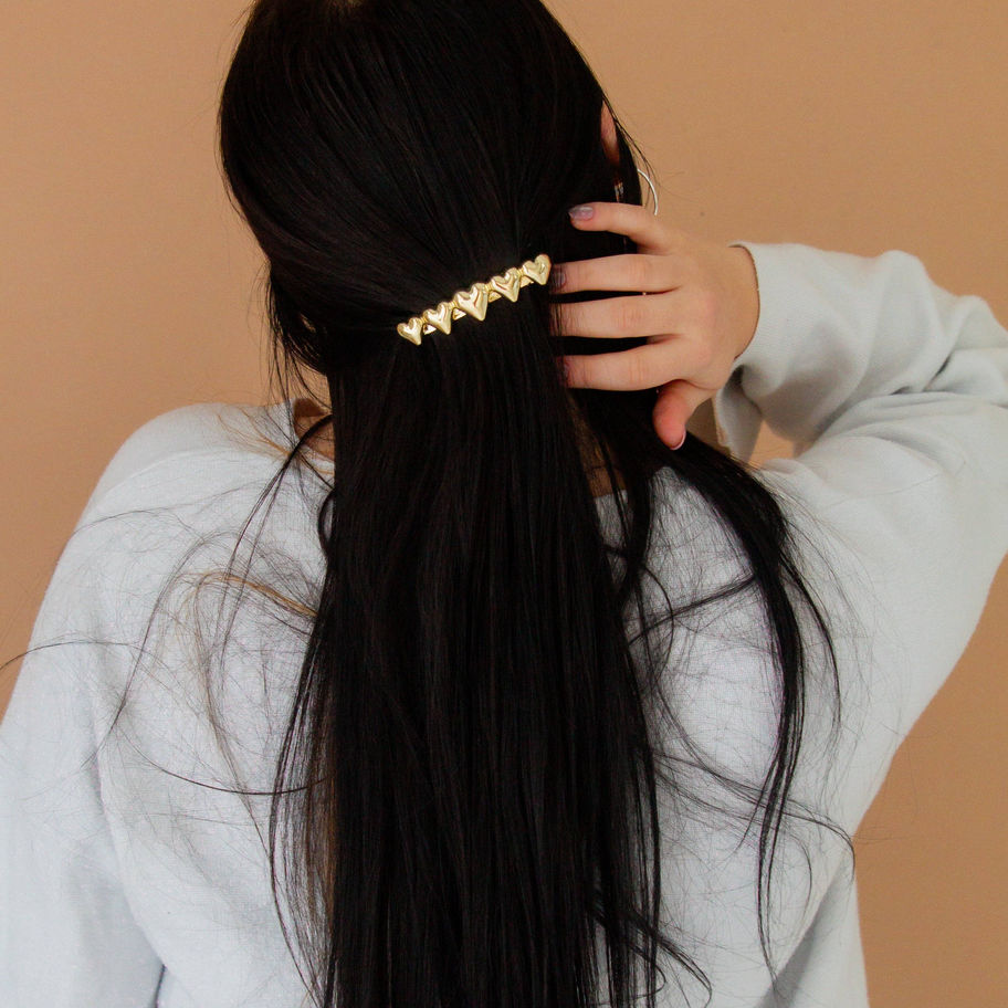 This barrette is to die for, and is so perfect for every hairstyle and outfit. The prettiest dainty piece with 5 gold hearts--the best accessory to add to any hairstyle for a little something extra.