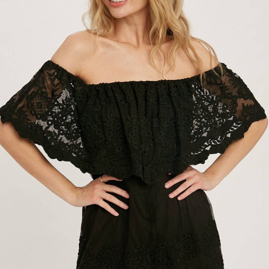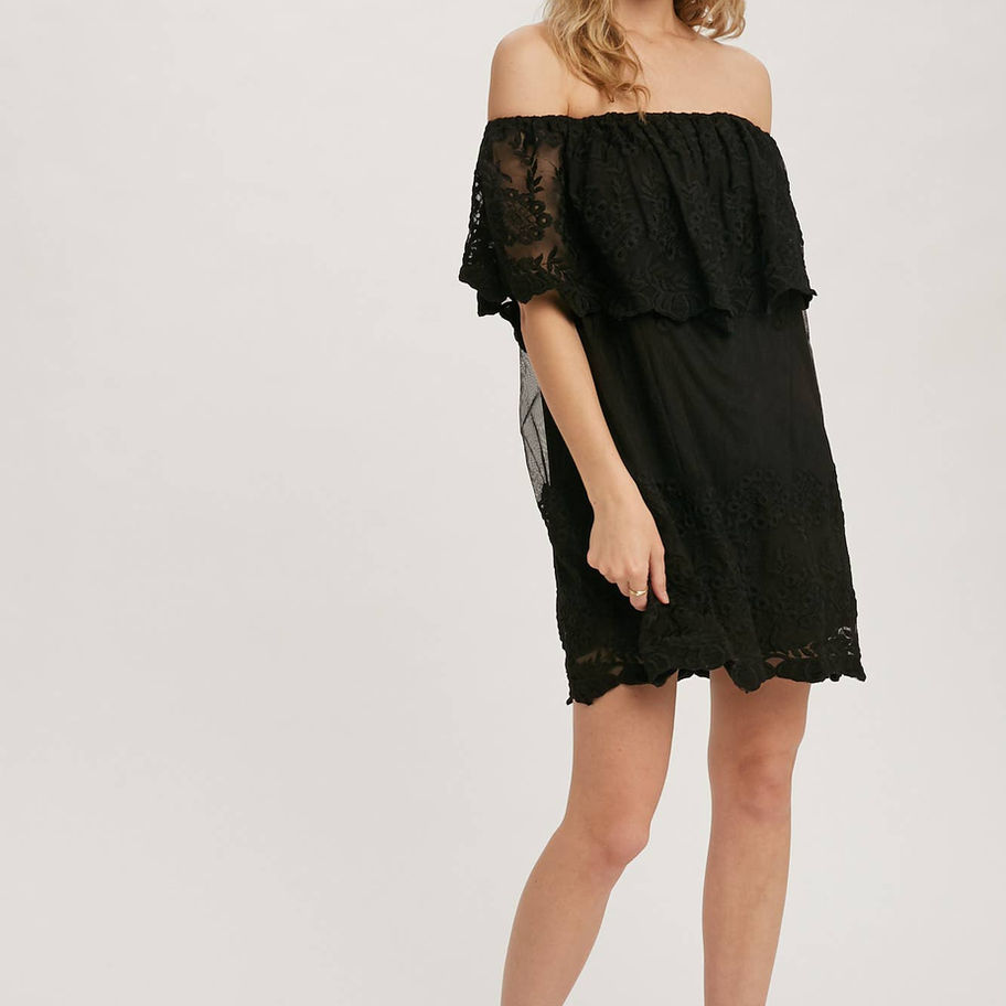 A woven dress featuring an all over floral lace fabric, elastic neckline, off the shoulder design, swingy flounce silhouette. -Model is 5'9" and wearing a Small