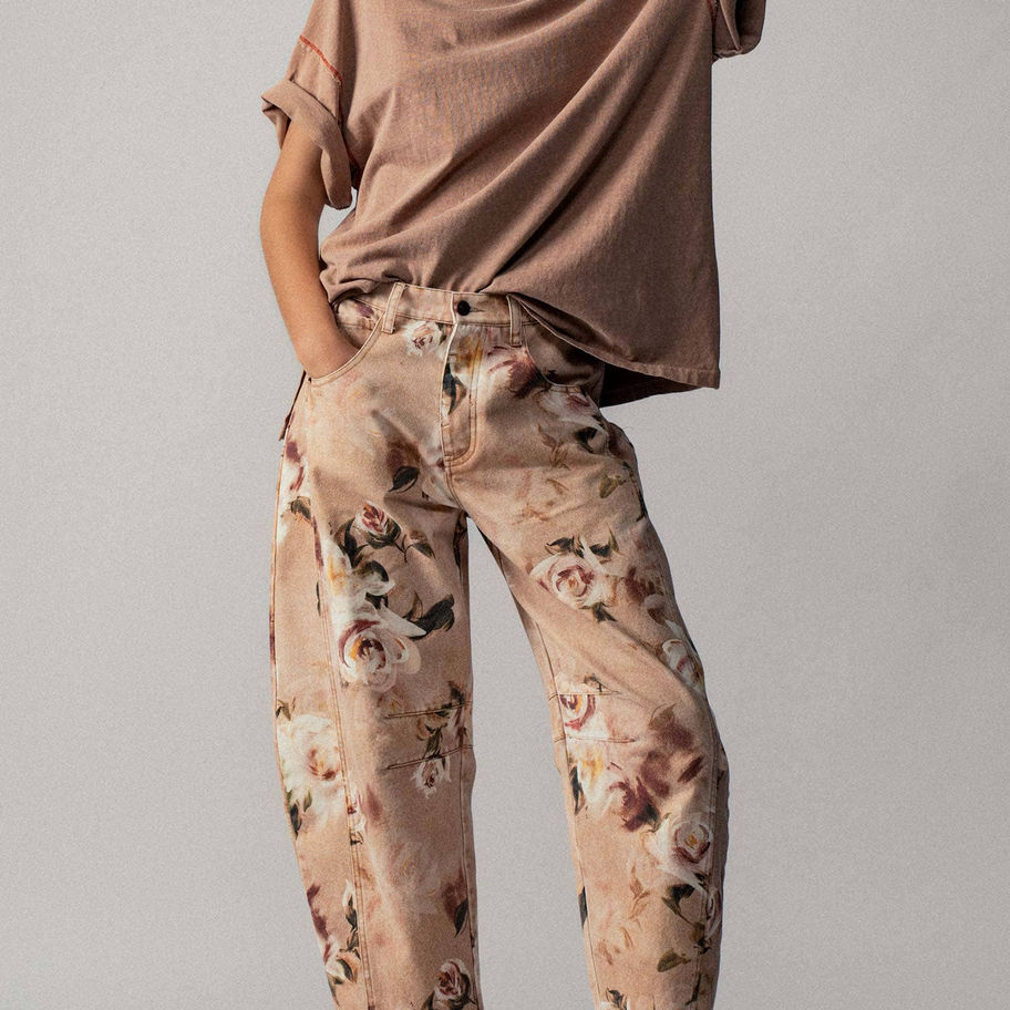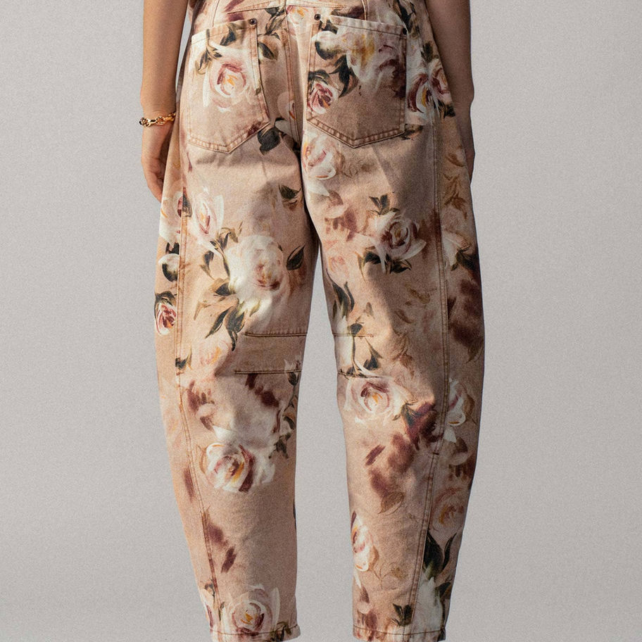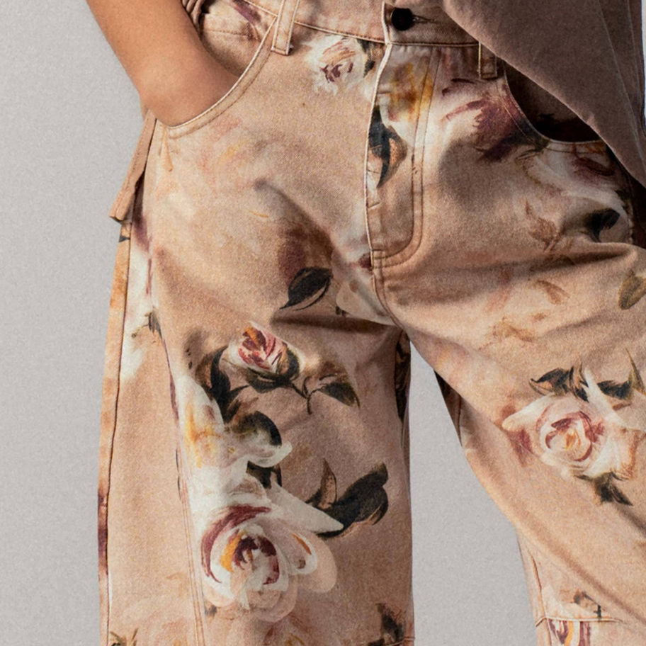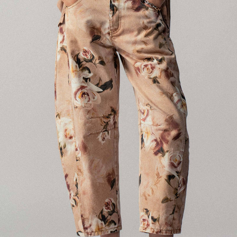These statement jeans feature a vintage-inspired rose print on a soft tan background, blending classic floral motifs with a modern wide-leg silhouette. Crafted from a comfortable cotton blend, they offer a relaxed fit perfect for spring and summer styling. Ideal for boutiques seeking standout denim for women’s clothing collections. Features: • 85% Cotton, 15% Polyester. Wide-leg silhouette for modern appeal • Relaxed fit for everyday comfort •